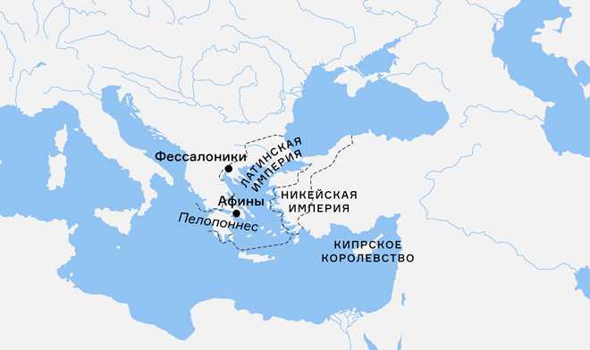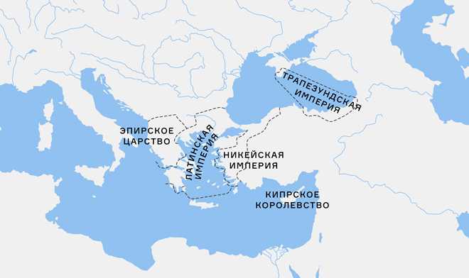 Утрата Константинополя привела к возникновению трех греческих государств, в равной мере претендовавших на то, чтобы быть полноправными наследниками Византии: Никейской империи на северо-западе Малой Азии под управлением династии Ласкарей; Трапезундской империи в северо-восточной части черноморского побережья Малой Азии, где обосновались потомки Комнинов — Великие Комнины, взявшие титул «императоры ромеев», и Эпирского царства в западной части Балканкого полуострова с династией Ангелов.