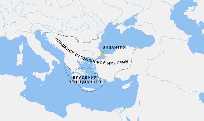 Последний византийский император Константин XI Палеолог предпринимал безуспешные попытки отразить османскую угрозу. К началу 1450-х годов Византия сохраняла лишь небольшой регион в окрестностях Константинополя (Трапезунд был от Константинополя фактически независим), а османы контролировали как большую часть Анатолии, так и Балканы (в 1430 году пала Фессалоника, в 1446 году был опустошен Пелопоннес).