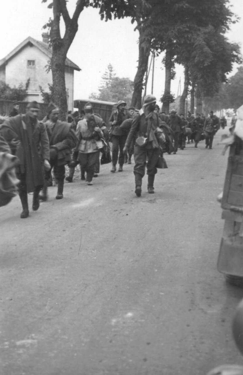 97. Колонна пленных французских солдат. Среди них много африканцев из французских колониальных частей.