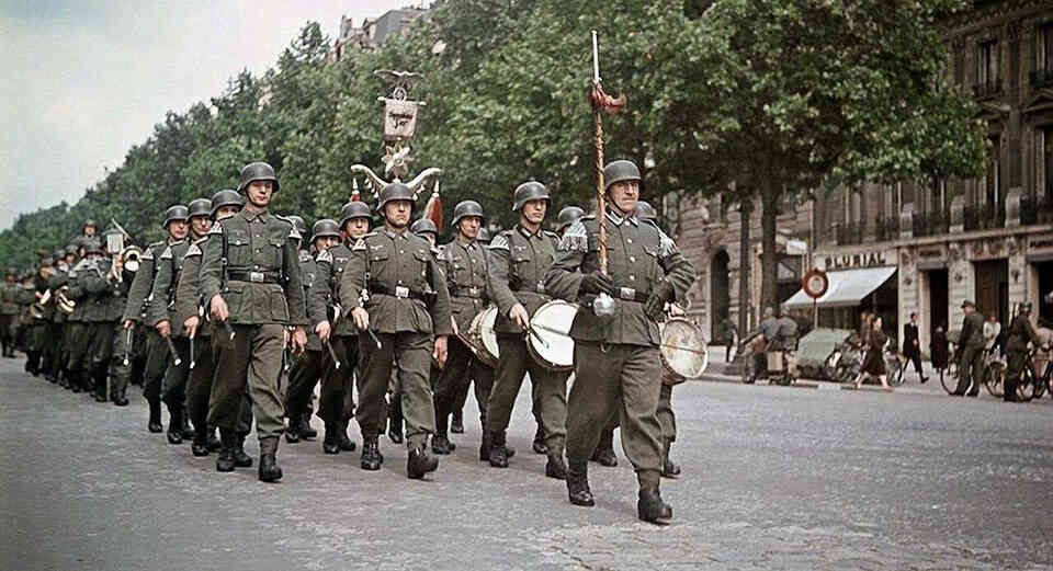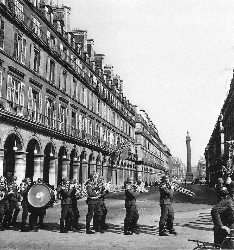 35. Немецкий военный оркестр проходит по улице оккупированного Парижа.