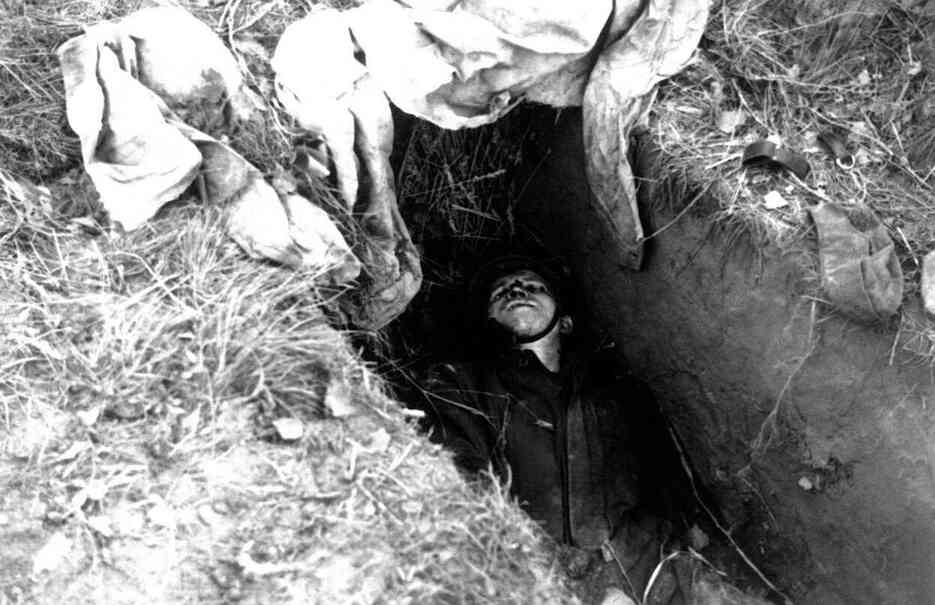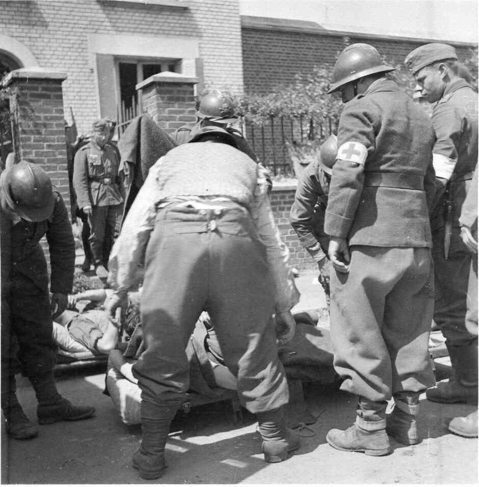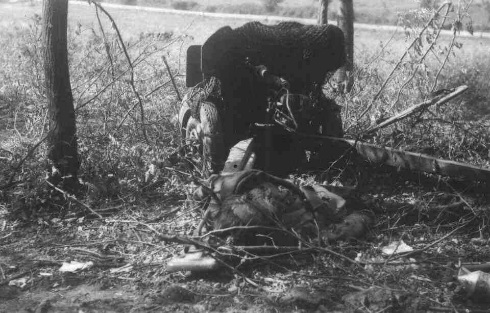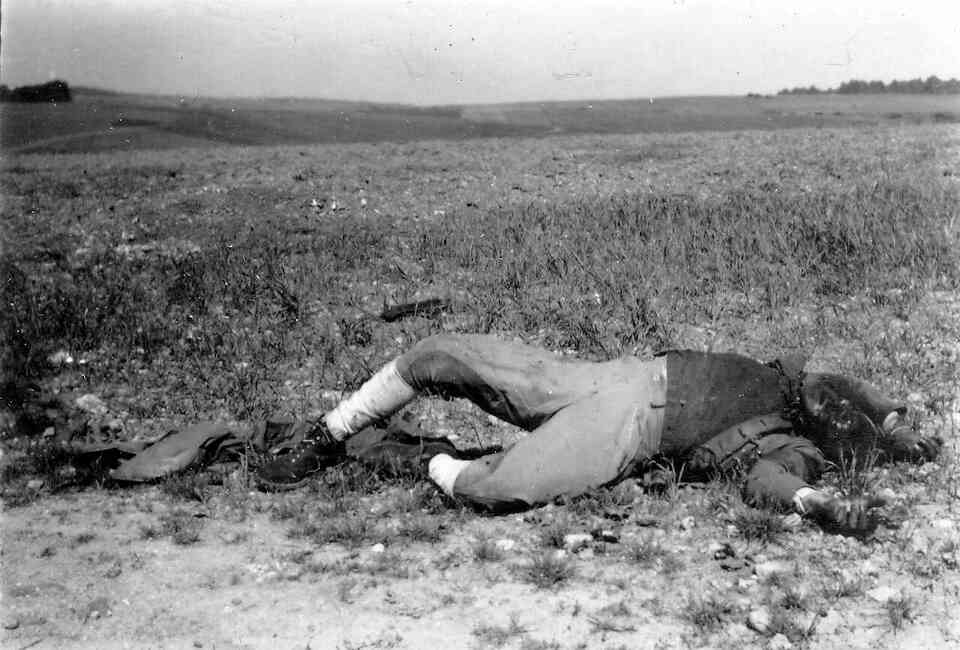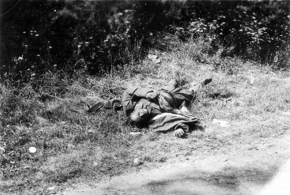 96. Немецкий солдат, убитый в бою входе французской кампании вермахта. На бруствере окопа — немецкая пилотка и части ремня.