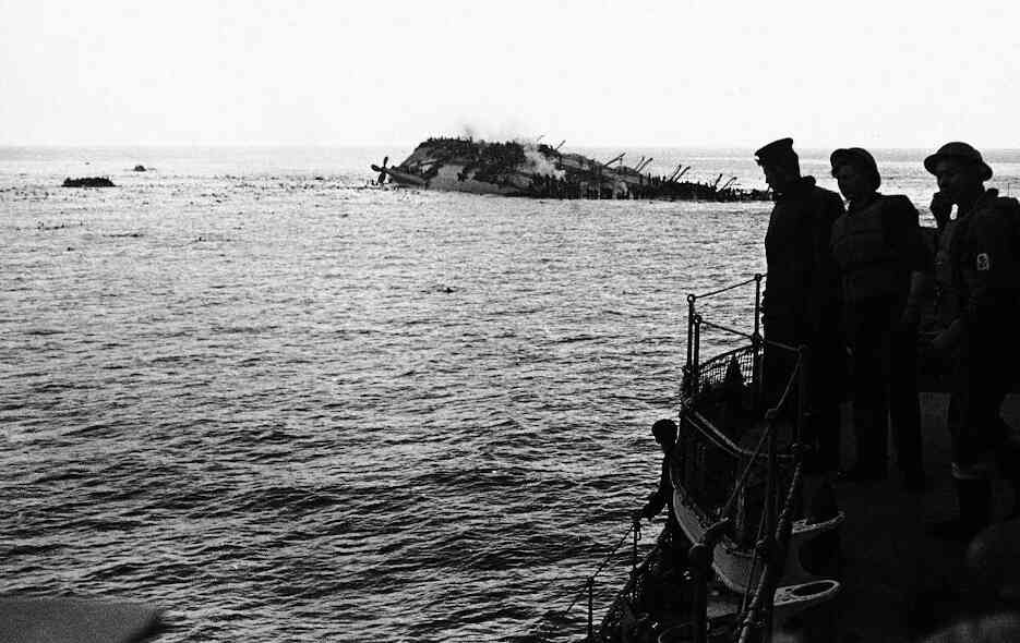 101. Гибель английского войскового транспорта «Ланкастрия» (RMS Lancastria) 17 июня 1940 года. В воде и на бортах накренившегося корабля видно множество пытающихся спастись людей. 17 июня 1940 года английский войсковой транспорт «Ланкастрия» (до войны пассажирский лайнер, совершавший круизы по Средиземному морю) водоизмещением 16 243 т. был потоплен немецкими бомбардировщиками Ju-88 у берегов Франции. Транспорт эвакуировал в Великобританию из Франции английские воинские части. На борту так же находилось большое число гражданских лиц, включая женщин и детей. Корабль был потоплен в ходе двадцатиминутной атаки вскоре после выхода из французского порта Сен-Назер (Saint-Nazaire). В результате погибло около четырех тысяч пассажиров — утонувшие, погибшие от разрывов бомб, обстрела, задохнувшиеся в загрязненной нефтью воде. Спасти удалось 2477 человек.