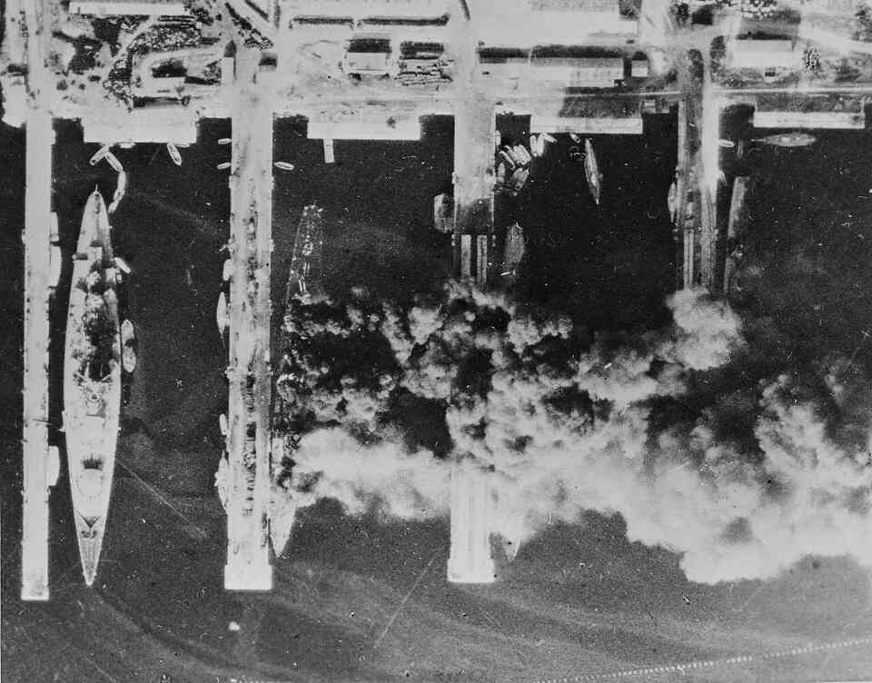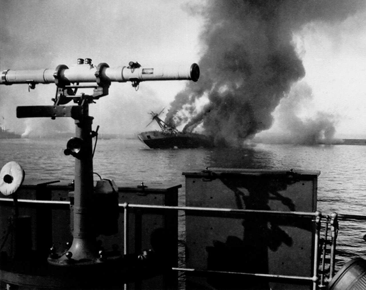 110. Горящие и затонувшие французские боевые корабли, сфотографированные с самолета британских ВВС на следующий день после затопления своими экипажами у причальных стенок в Тулоне.