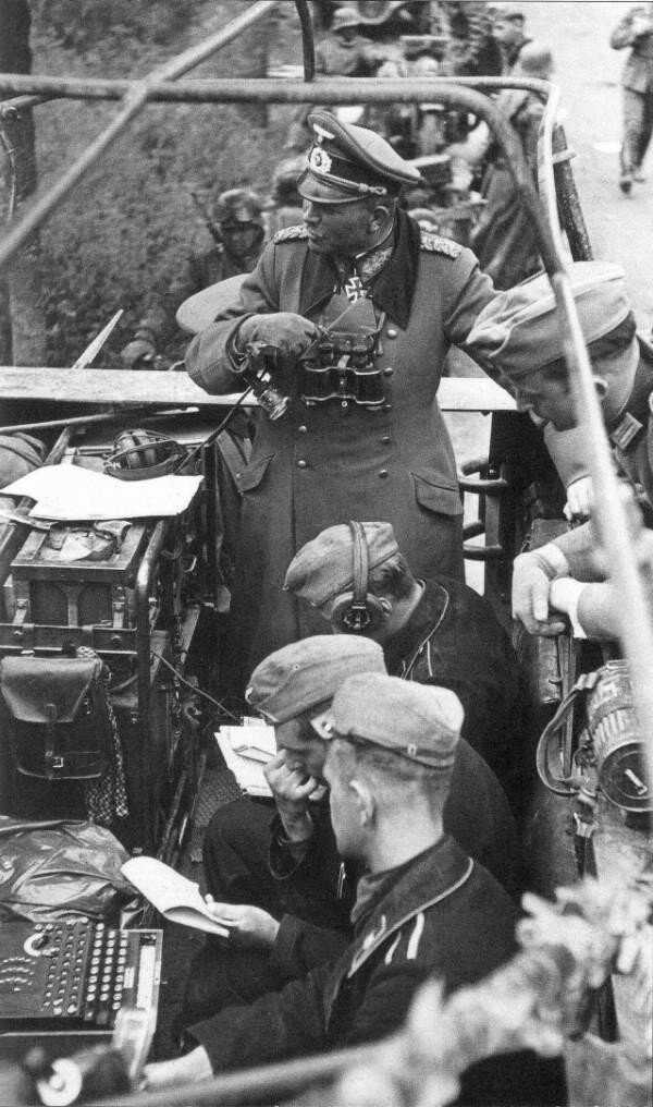 117. Передвижной командный пункт вермахта. В центре Хайнц Гудериан, слева внизу шифровальная машина «Энигма». Фотография сделана на борту радиофицированного бронетранспортера Sd.Kfz. 251/3. Франция, май-июнь 1940 г.