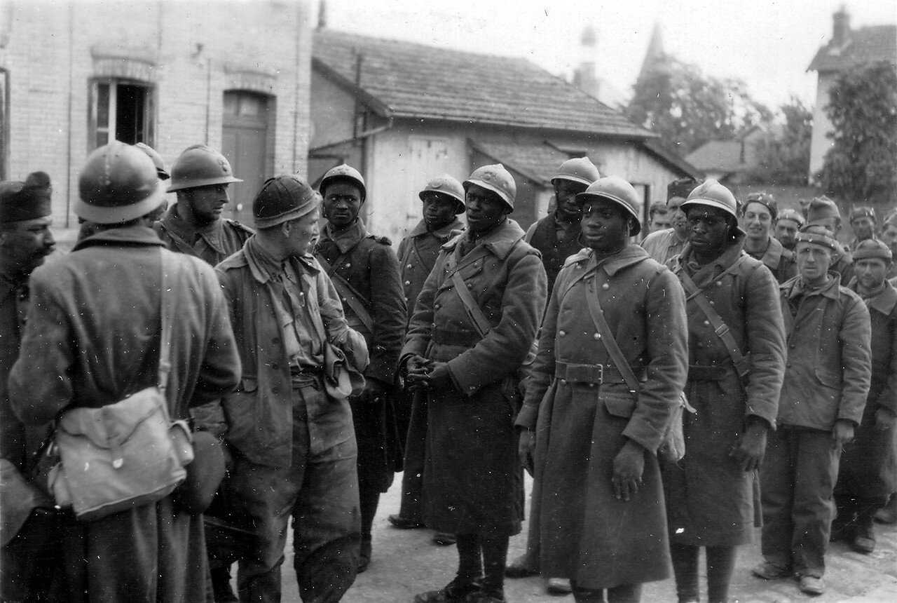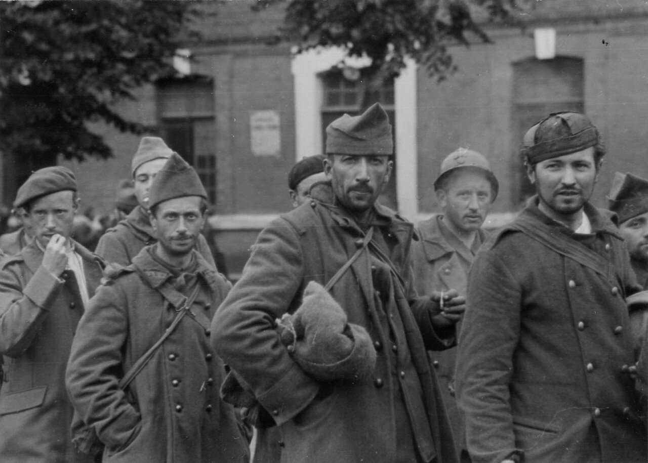 27. Французские военнопленные на сборном пункте. Среди пленных военнослужащие французских североафриканских колониальных войск, предположительно сенегальцы.