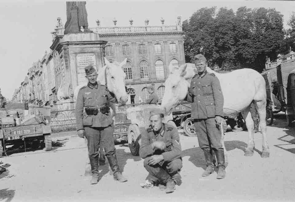 90. Немецкие солдаты с лошадьми на площади Станислава во французском городе Нанси у памятника польскому королю Станиславу Лещинскому.