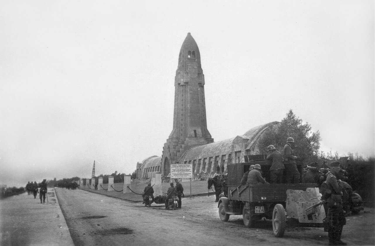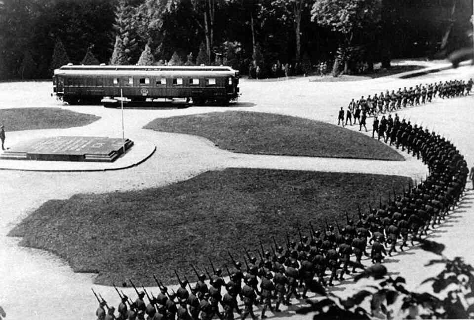 114. Церемониальный марш немецких войск в Компьене во время переговоров о перемирии между немецким командованием и Францией. В центре — исторический железнодорожный вагон, в котором было подписано первое Компьенское перемирие, зафиксировавшее поражение Германии в Первой мировой войне. Новое Компьенское перемирие было подписано в этом же вагоне, символизируя реванш Германии.