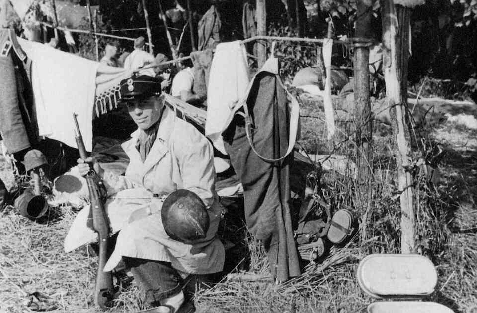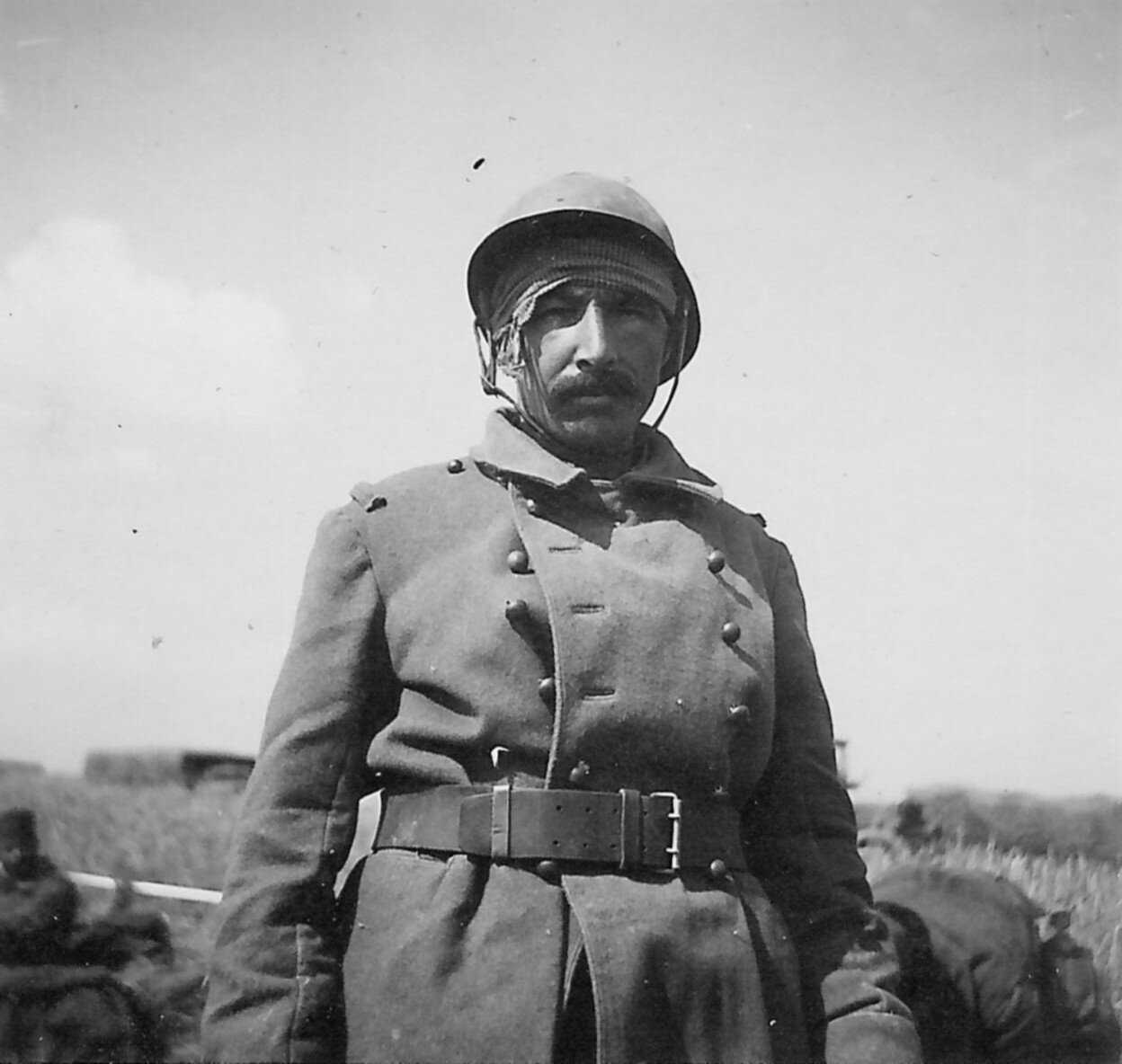 69. Немецкий солдат демонстрирует трофеи — захваченное вооружение и амуницию французских войск. Фото из фотоальбома рядового-повозника пехотной дивизии вермахта.