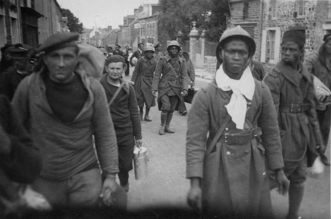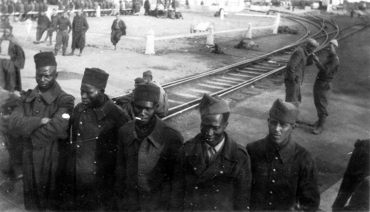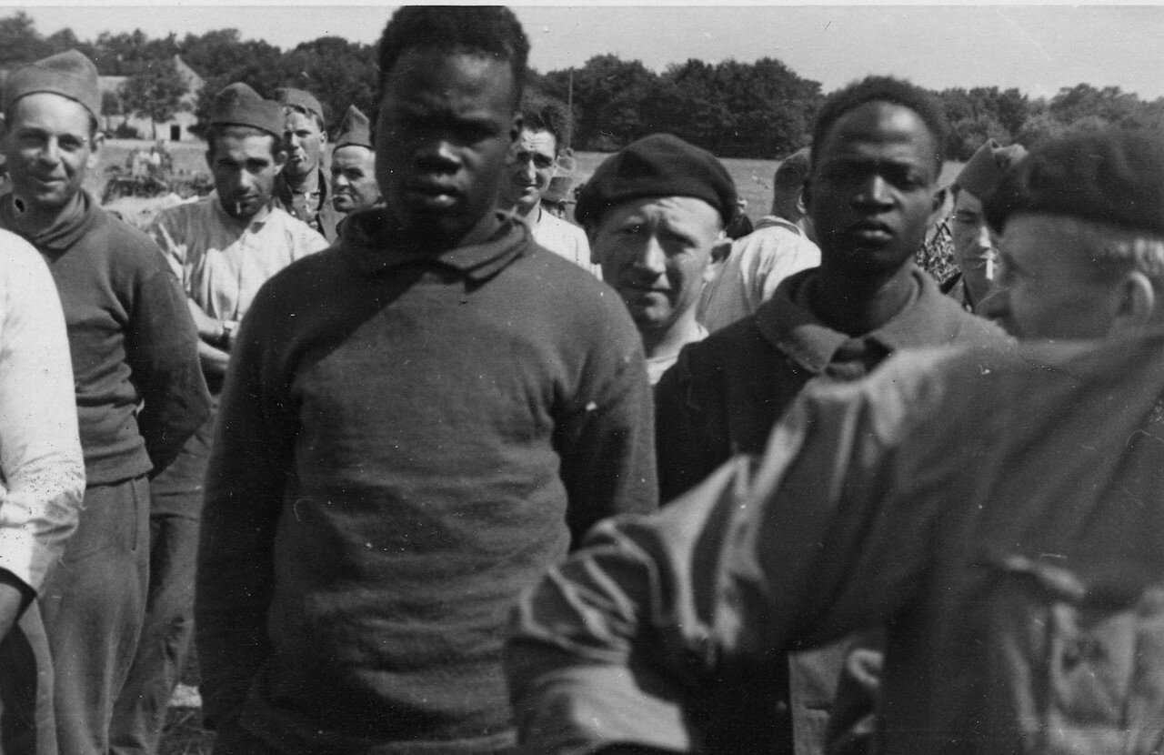 55. Немецкие солдаты и французские пленные из колониальных частей в лагере в казармах Прото в Шербуре.