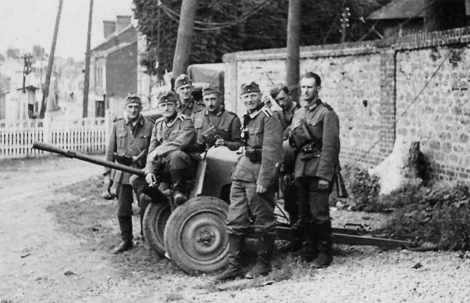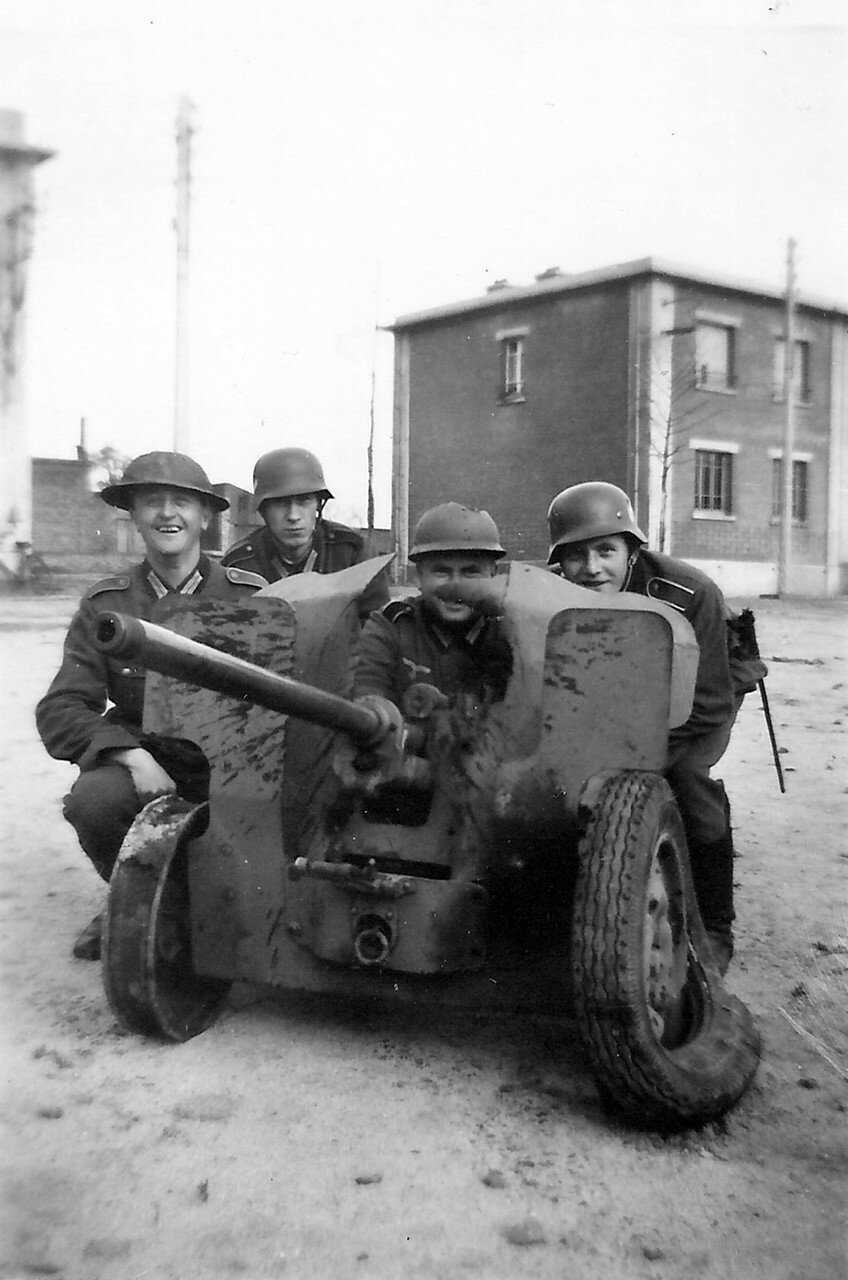41. Немецкие солдаты позируют рядом с разбитой французской 25-мм противотанковой пушкой Гочкиса (Canon de 25 mm antichar Modele 1934 Hotchkiss).