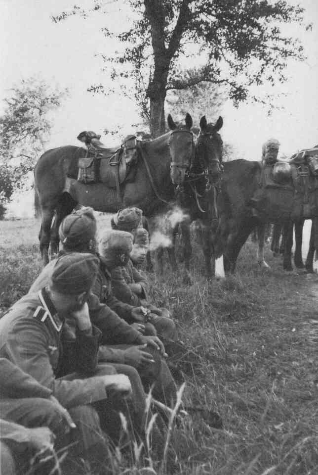 66. Немецкие солдаты курят рядом с лошадьми. Из фотоальбома рядового-повозника пехотной дивизии вермахта.