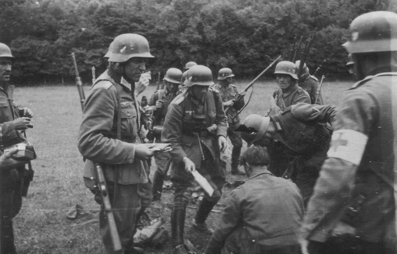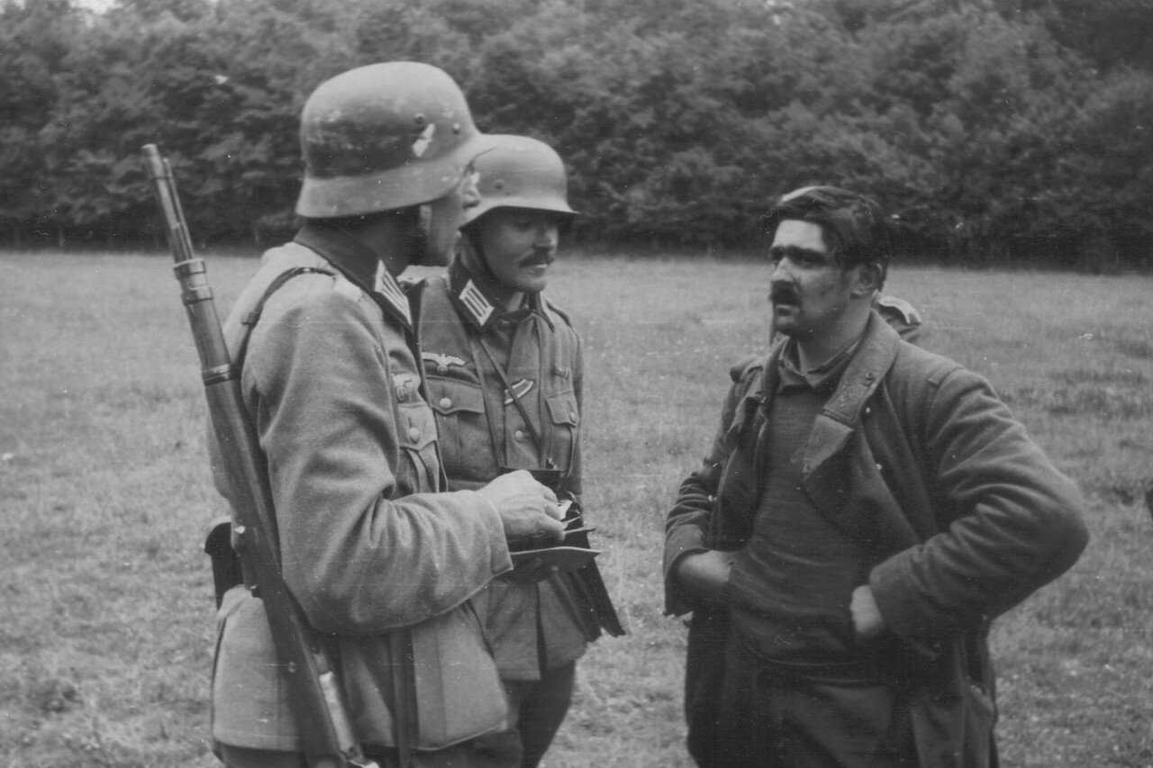 85. Солдаты 73-го пехотного полка вермахта допрашивают французского военнопленного.