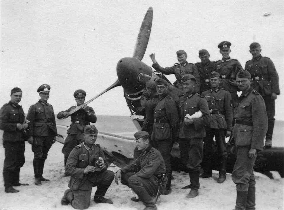 9. Немецкие солдаты и офицер позируют у сбитого британского истребителя «Спитфайр» (Supermarine Spitfire Mk.I) на пляже в районе Дюнкерка.