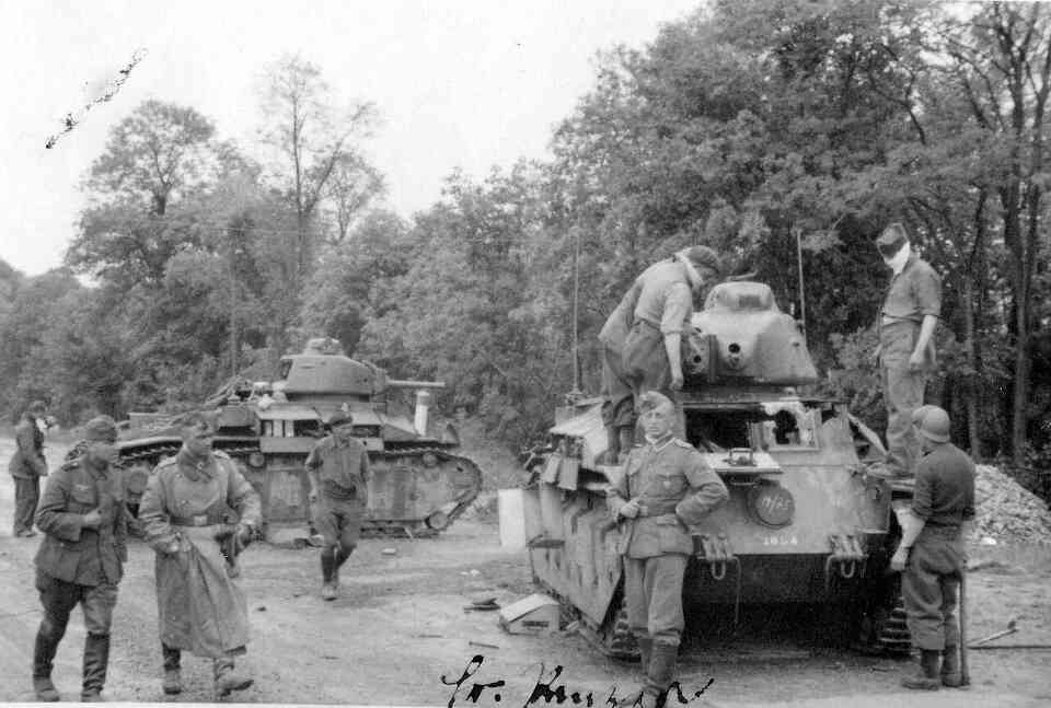8. Немецкие солдаты рядом с французским легким танком Renault R35, брошенным на дороге у Лана.