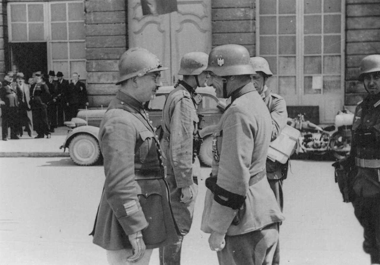 115. Представители Франции направляются в «вагон маршала Фоша» для переговоров о перемирии с представителями Германии. На этом самом месте, в этом самом вагоне 11 ноября 1918 года было подписано унизительное для Германии Компьенское перемирие, зафиксировавшее позорное поражение Германии в Первой мировой войне. Подписание нового Компьенского перемирия на этом же месте, по замыслу Гитлера, должно было символизировать исторический реванш Германии. Для того, чтобы выкатить вагон на поляну, немцы разрушили стену музея, где он хранился, и проложили рельсы до исторического места.