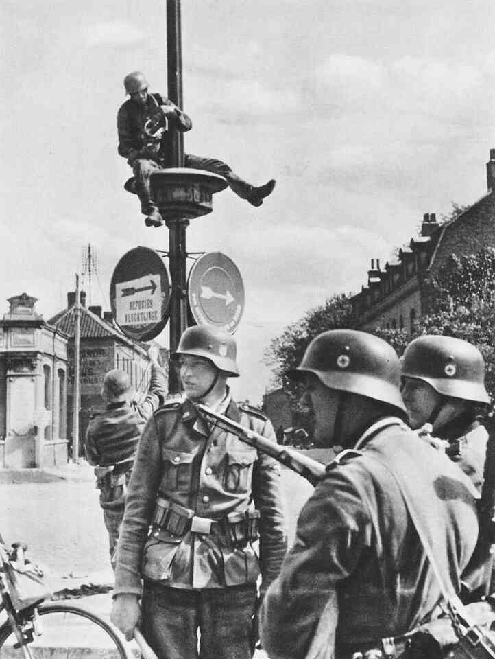 109. Солдаты дивизии СС «Мертвая голова» регулируют движение на улице французского города, ускоряя продвижение отстающих войск.