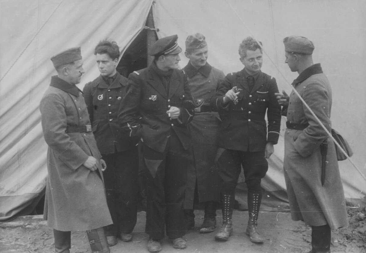 45. Пленные французские летчики разговаривают с немецкими солдатами у палатки.