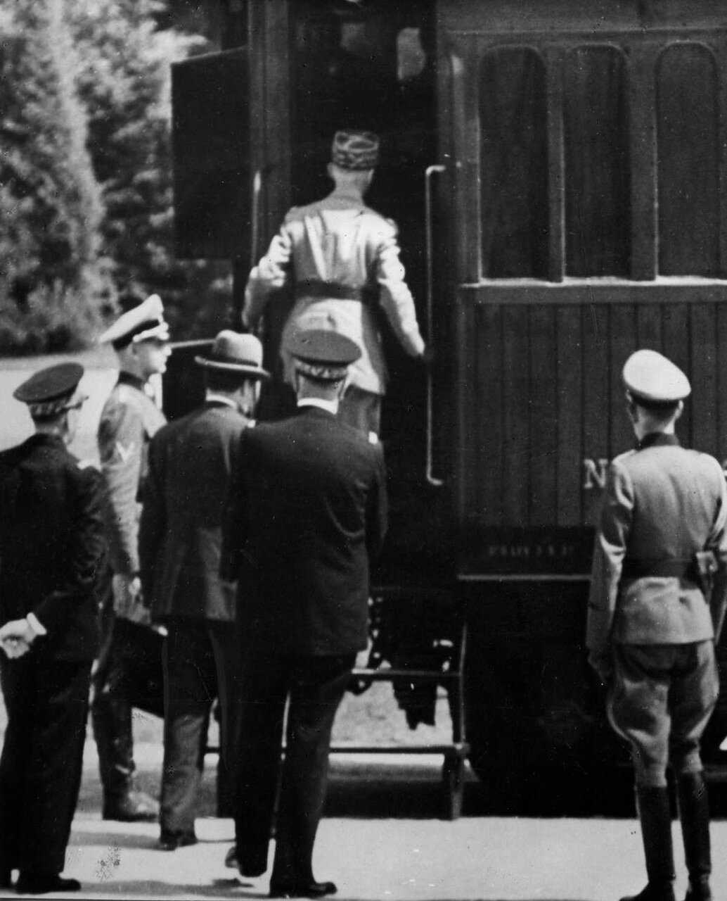 64. Представители Франции направляются в «вагон маршала Фоша» для переговоров о перемирии с представителями Германии. На этом самом месте, в этом самом вагоне 11 ноября 1918 года было подписано унизительное для Германии Компьенское перемирие, зафиксировавшее позорное поражение Германии в Первой мировой войне. Подписание нового Компьенского перемирия на этом же месте, по замыслу Гитлера, должно было символизировать исторический реванш Германии. Для того, чтобы выкатить вагон на поляну, немцы разрушили стену музея, где он хранился, и проложили рельсы до исторического места.