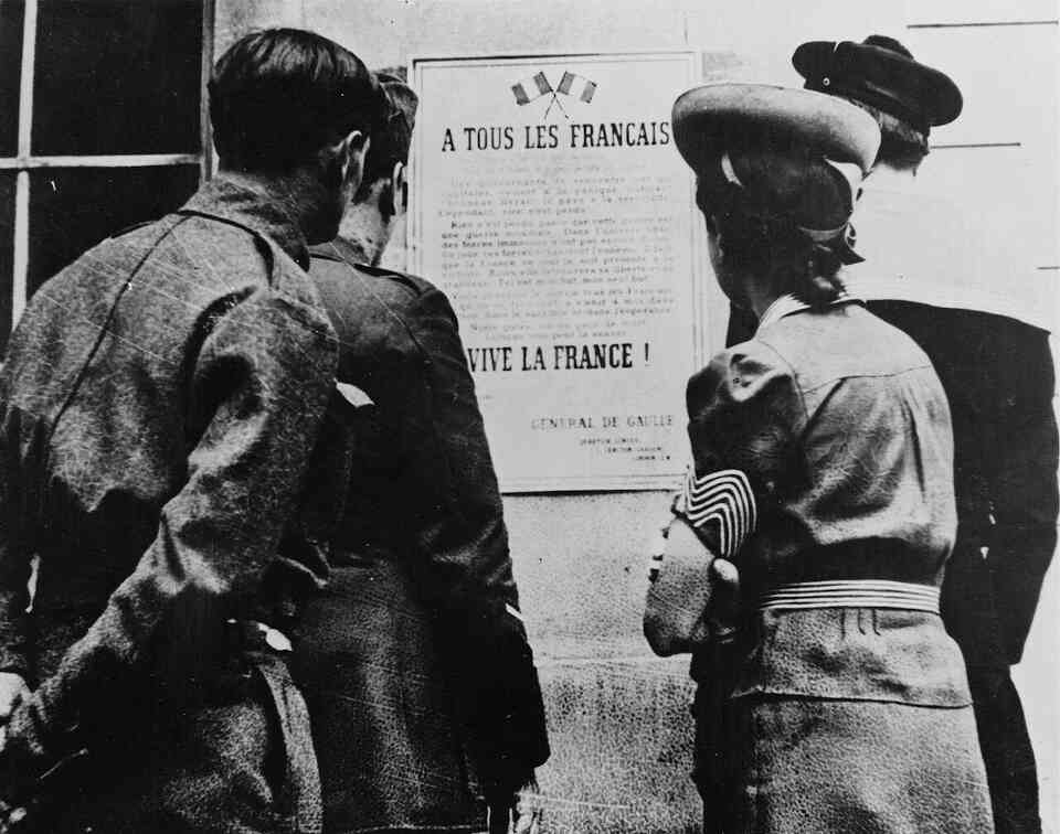 92. Французы читают воззвание Шарля де Голля от 18 июня 1940 года на стене дома в Лондоне.