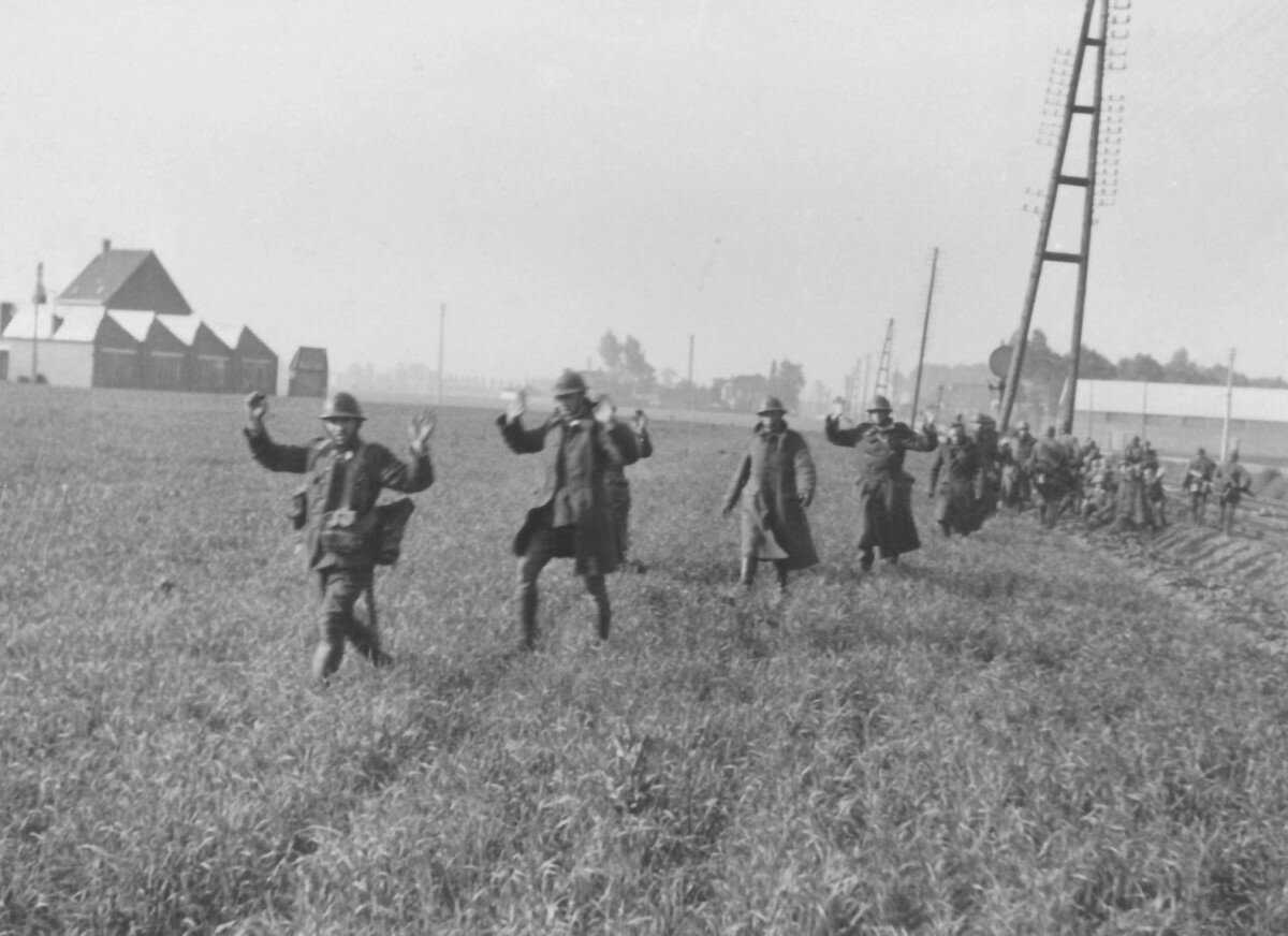 21. Французские солдаты с поднятыми руками сдаются немецким войскам.
