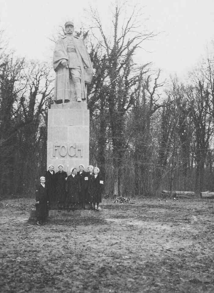 76. Немецкие медсестры у памятника маршалу Франции Фердинанду Фошу в Компьенском лесу. Совсем рядом с этим местом была подписана капитуляция Франции в войне с Германией (а в 1918 г. — капитуляция Германии в Первой мировой войне).