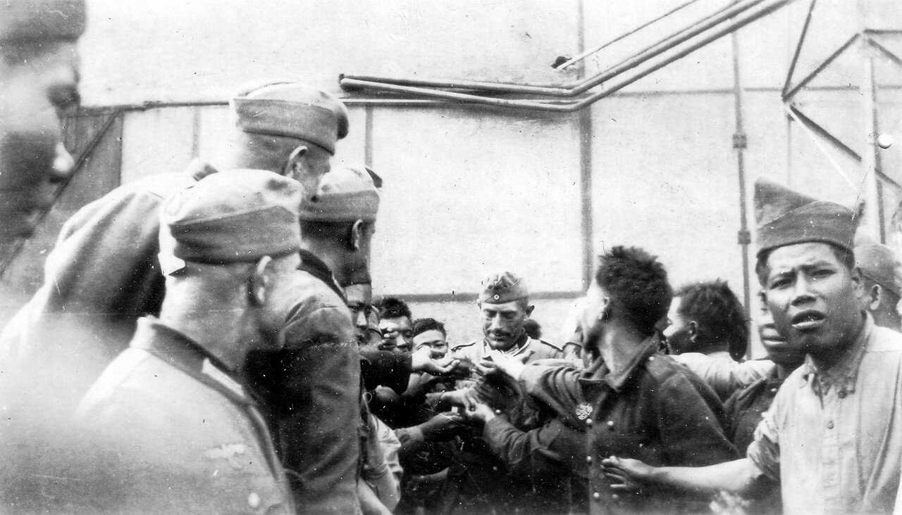 56. Немецкий солдат раздает сигареты пленным французских колониальных частей.
