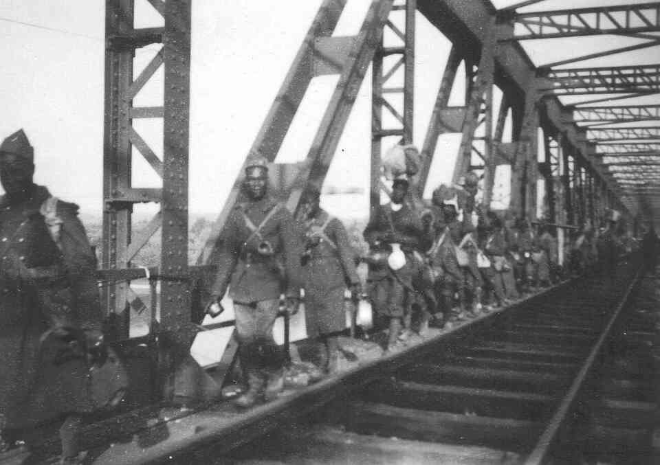 82. Колонна французских пленных колониальных частей на марше на железнодорожном мосту.