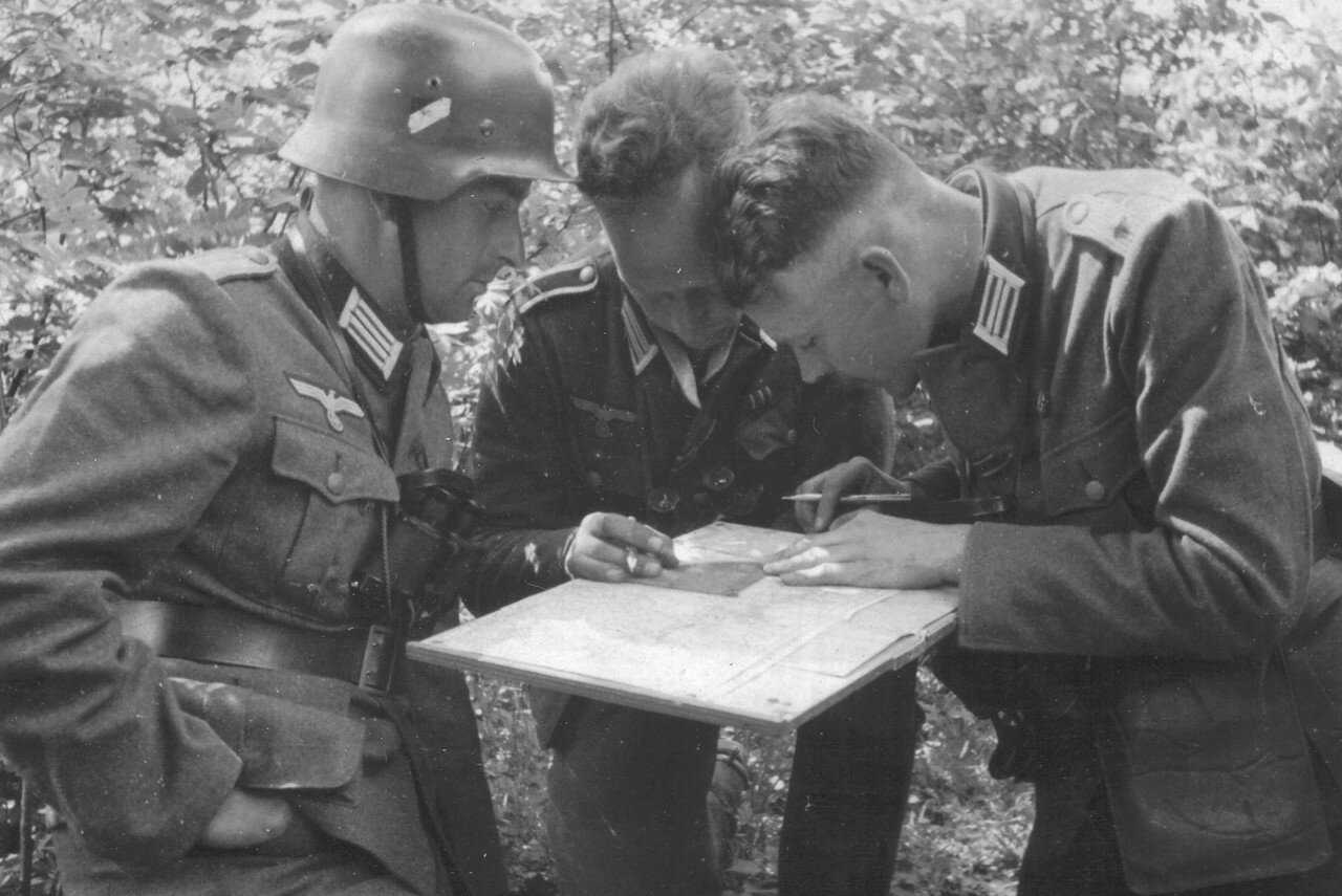 72. Два немецких офицера и унтер-офицер смотрят на карту.