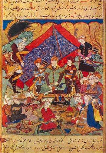 Таким образом Самарканд, который Тимур сделал столицей своего царства, и Кеш, оставленный как летняя резиденция, редко удостаивались чести принимать в своих стенах грозного бега; большие дворцы и парки, которые он по татарскому обычаю велел выстроить и развести в обоих этих местах, как позже и во многих других больших городах становившегося все обширнее государства, стояли большей частью пустыми: его отечеством был военный лагерь.