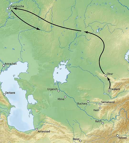 С ними выступил он, чтобы вновь завоевать остальные провинции царства то есть, Среднюю Азию, из которых самой значительной и все еще самой цветущей была область Окса Амударьи. Маленький князь Кеша со своими слабыми силами не в состоянии был противостоять нападению; но в то время, как он свернул по направлению к Хорасану, его племянник Тимур отправился в неприятельский стан и объявил свое подчинение владычеству Туглука (761=1360). Понятно, он был принят с радостью и пожалован областью Кеша; но едва хан успел увериться в обладании