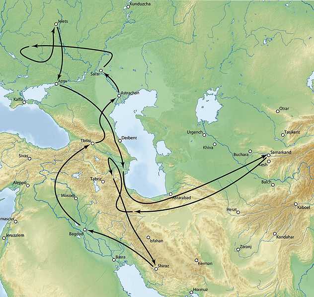 Уже по возвращении с востока мы находим Тимура достаточно сильным, чтобы вмешаться в дела значительно большего, хотя, без сомнения, расслабленного внутренними смутами государства, именно Кипчака, которое со времени смерти Узбека, сына Джани-Бека (758=1357), было потрясено продолжительными дворцовыми революциями и распалось на несколько отдельных государств, совершенно как царство Джагатая, с той разницей, что оно до тех пор не нашло себе такого сильного восстановителя, как Тимур.