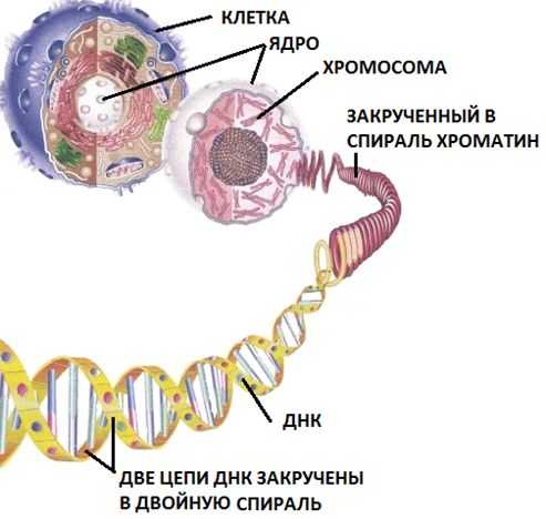 Хроматин представляет собой нити ДНК. Если клетка начинает делиться, то нити хроматина плотно накручиваются спиралью на особые белки, как нитки на катушку. Такие плотные образования хорошо видны в микроскоп и называются хромосомами.