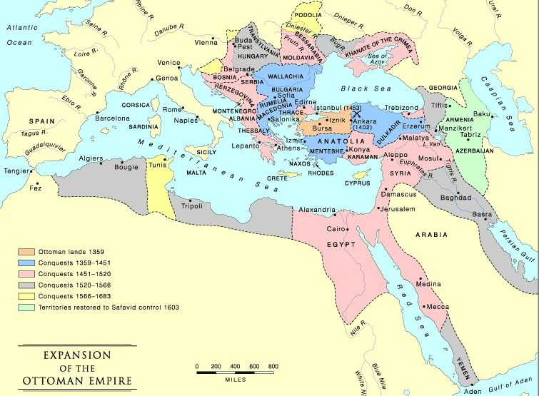 Карта, показывающая расширение Османской империи (начиная с 1359 года, когда османы уже имели небольшое государство в Анатолии).