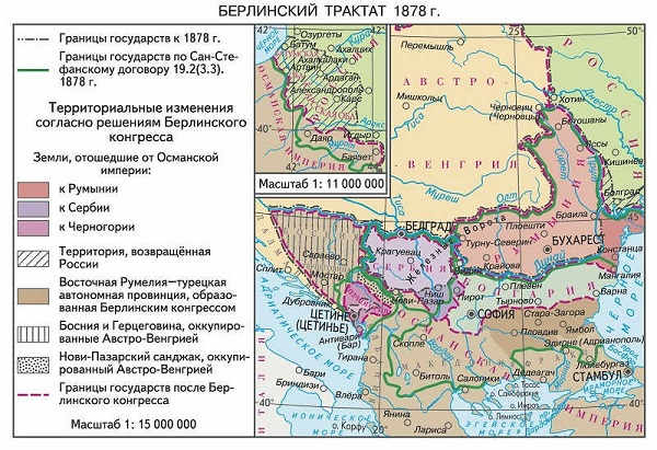 Попытка российских дипломатов отстоять идею «Великой Болгарии» не увенчалась успехом. Болгарское государство приобретало статус автономии, создавалось вассальное княжество с христианским правительством и национальной армией. Области к югу от балканского хребта превращались в автономную провинцию Восточная Румелия. Македония оставалась под управлением Турции. Австро-Венгрия получала право оккупировать славянское государство Боснию и Герцеговину.