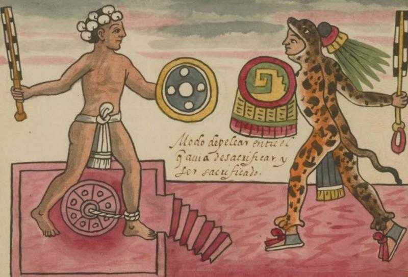 Воины любили взять пленного, тоже воина, привязать его к камню за ногу, дать макуауитль, в котором вместо обсидиана были вставлены птичьи перья, и нападать на него вчетвером. Надо ли говорить, что такой прообраз гладиаторских игр стал очень популярен. Правда, однажды вышла некрасивая история: захваченный вождь другого племени по имени Тлауикол перебил в таком ритуале больше двадцати воинов. После такого обалдевшим ацтекам пришлось с почестями отпустилть его на свободу.